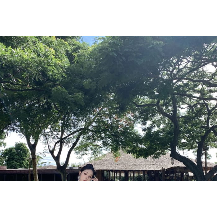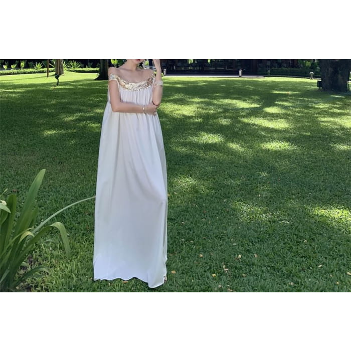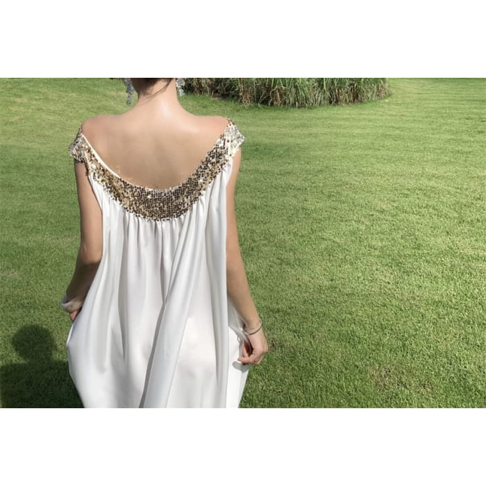 Ärmelloses, schulterfreies Maxikleid mit Pailletteneinsatz und Schlitz