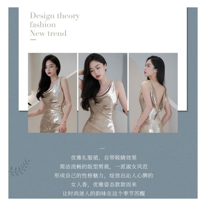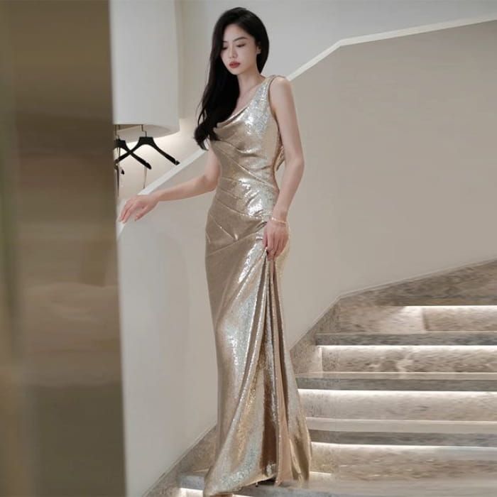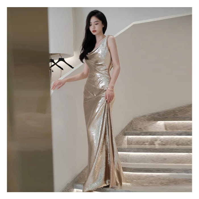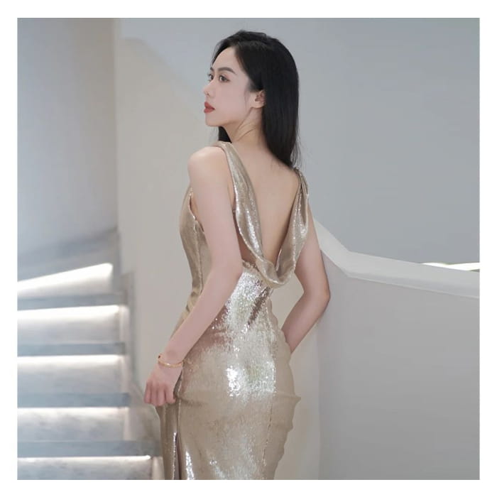 Ärmelloses Abendkleid mit Trompetenärmeln und offenem Rücken und Pailletten