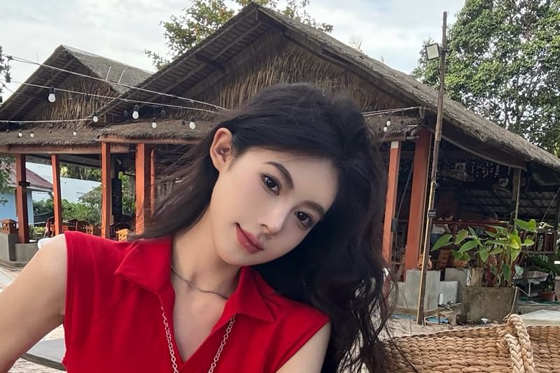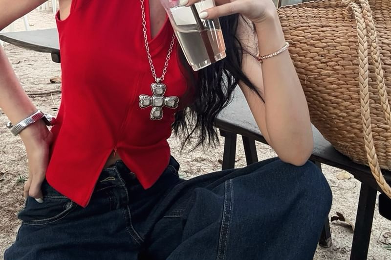Sleeveless Collared Plain Zipped Slit Slim Fit Crop Top