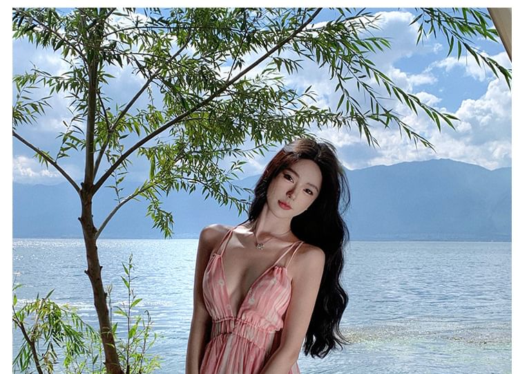 Spaghetti Dress A-Line Floral Print Maxi V-Neck Strap