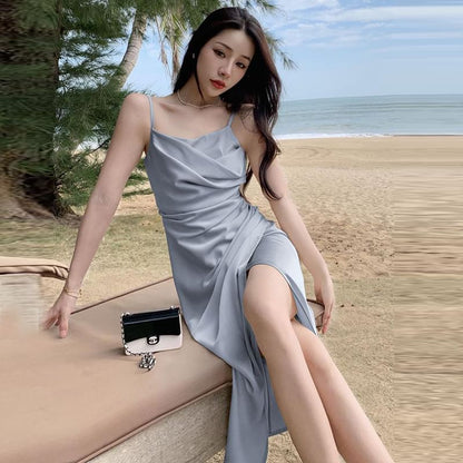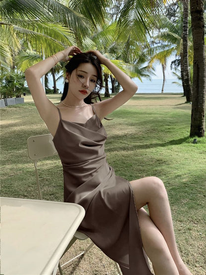 Spaghetti Strap Cowl Neck Plain Ruched Satin Slit Midi Sheath Dress