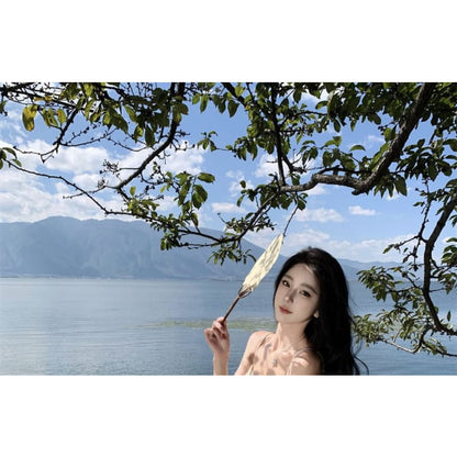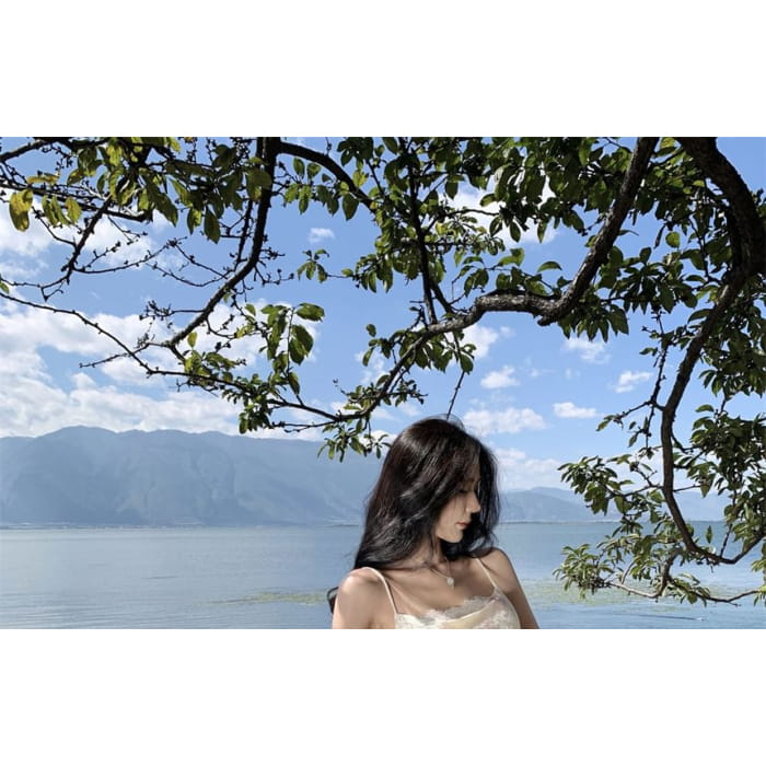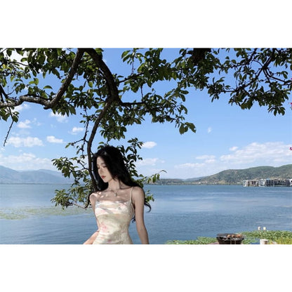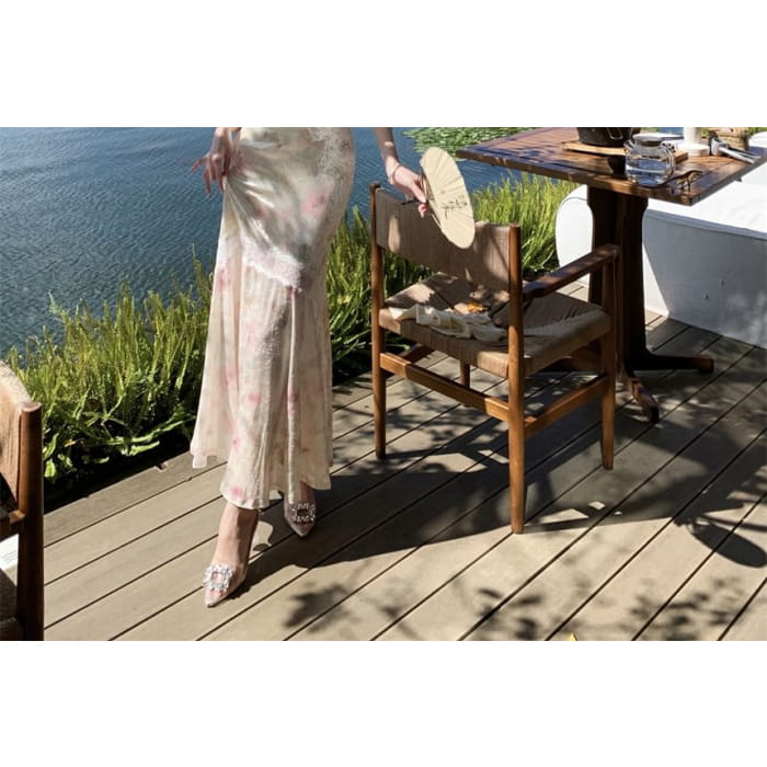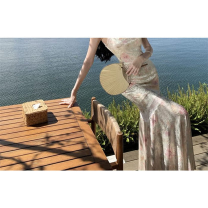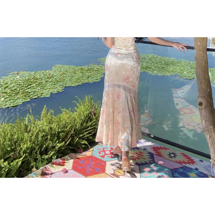 Midi-Meerjungfrauenkleid mit Spaghettiträgern, Blumendruck und Spitzenbesatz