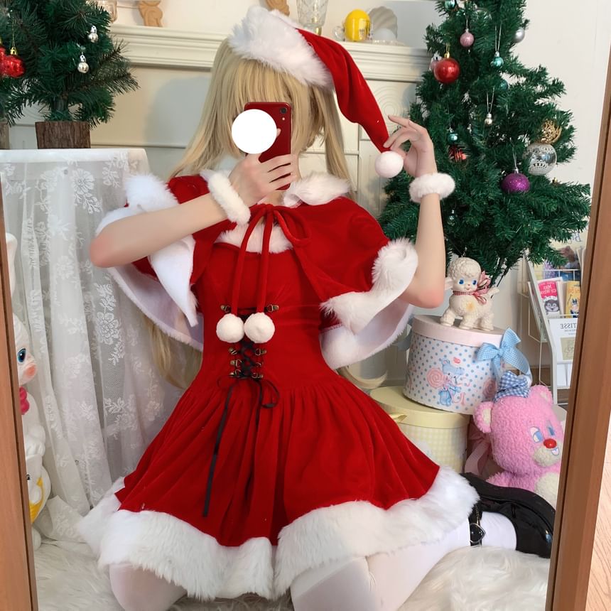 Spaghetti Strap Fluffy Trim Lace Up Mini A-Line Dress / Cape / Christmas Hat / Set