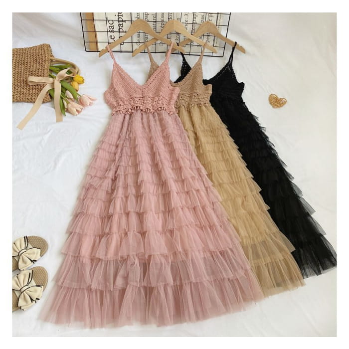 Schlichtes, gestuftes Midi-A-Linien-Kleid mit Spaghettiträgern, V-Ausschnitt