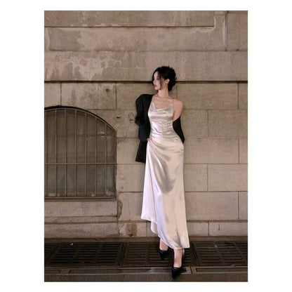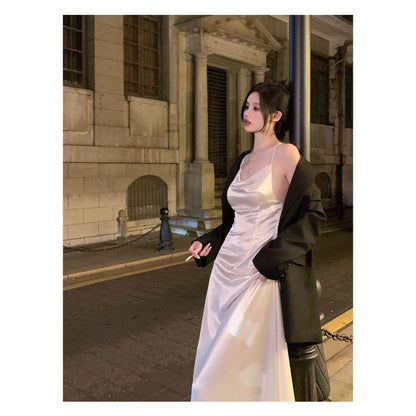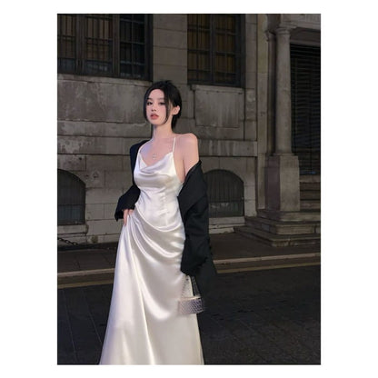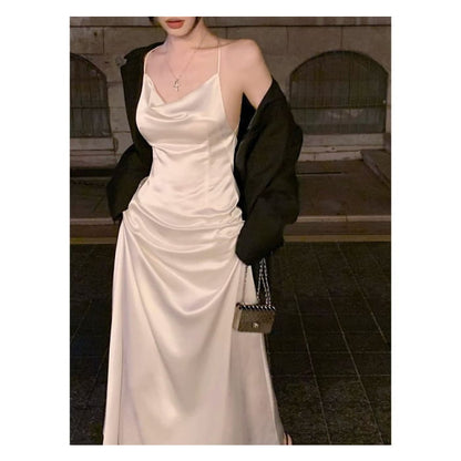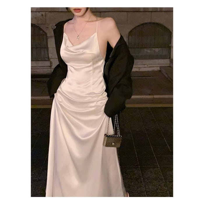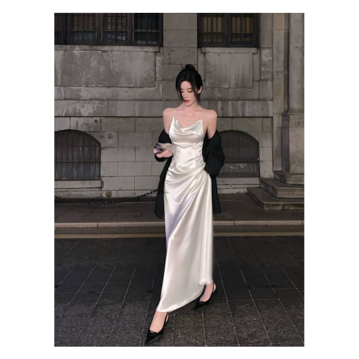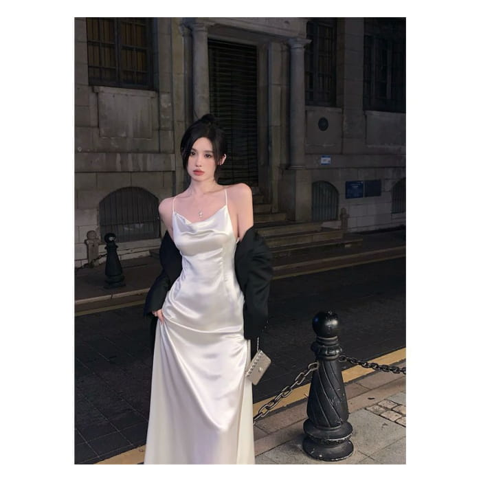 Maxi-A-Linien-Kleid aus Satin mit Spaghettiträgern und V-Ausschnitt