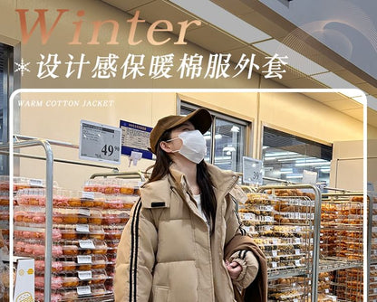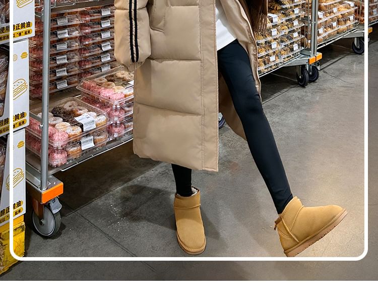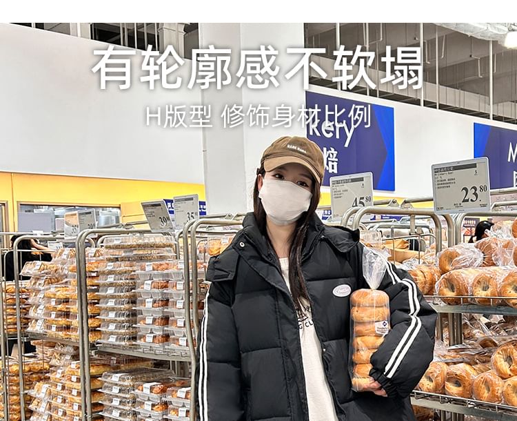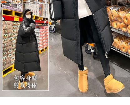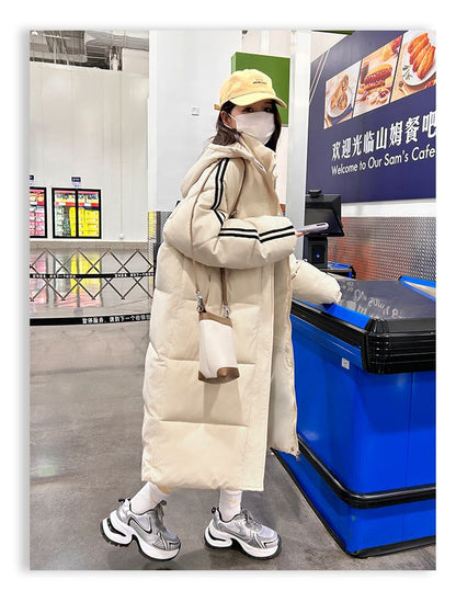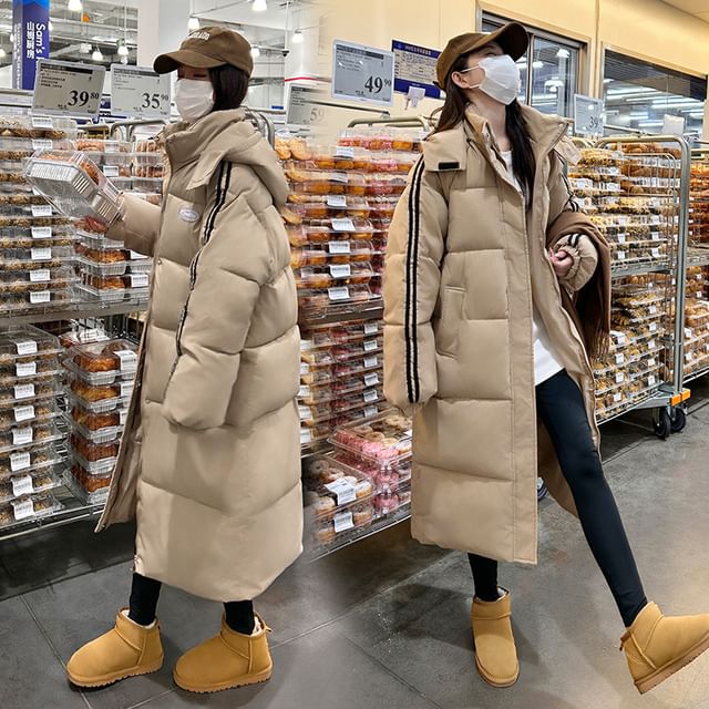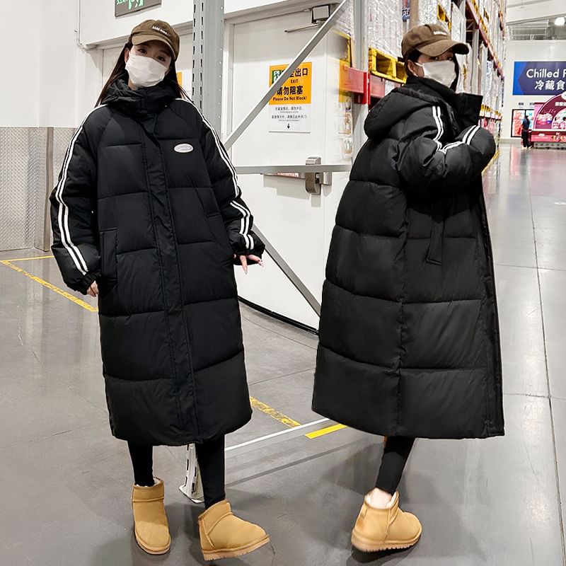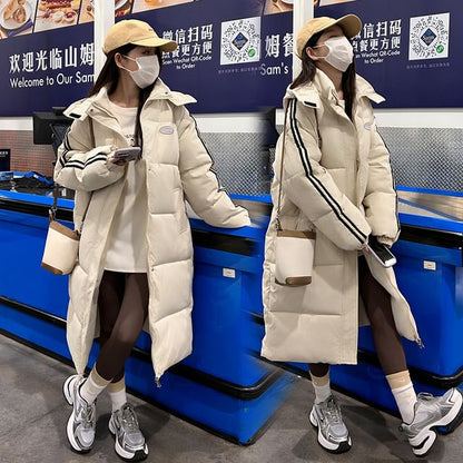 Stand Collar Striped Hood Midi Zip Puffer Coat