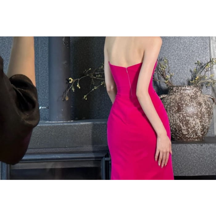 Trägerloses, figurbetontes Midikleid mit Blumenmuster, Schlitz und asymmetrischem Wickeldesign