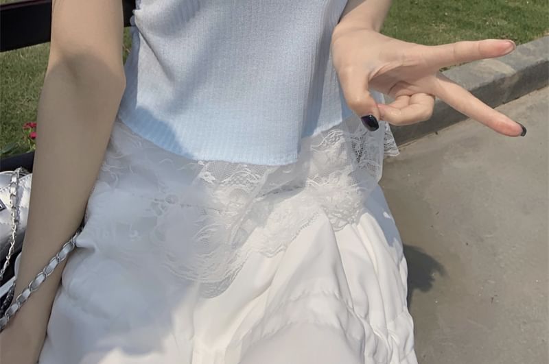 Short-Sleeve V-Neck Lace Trim Plain Knit Top