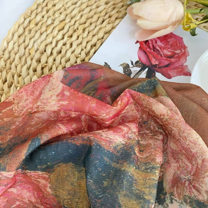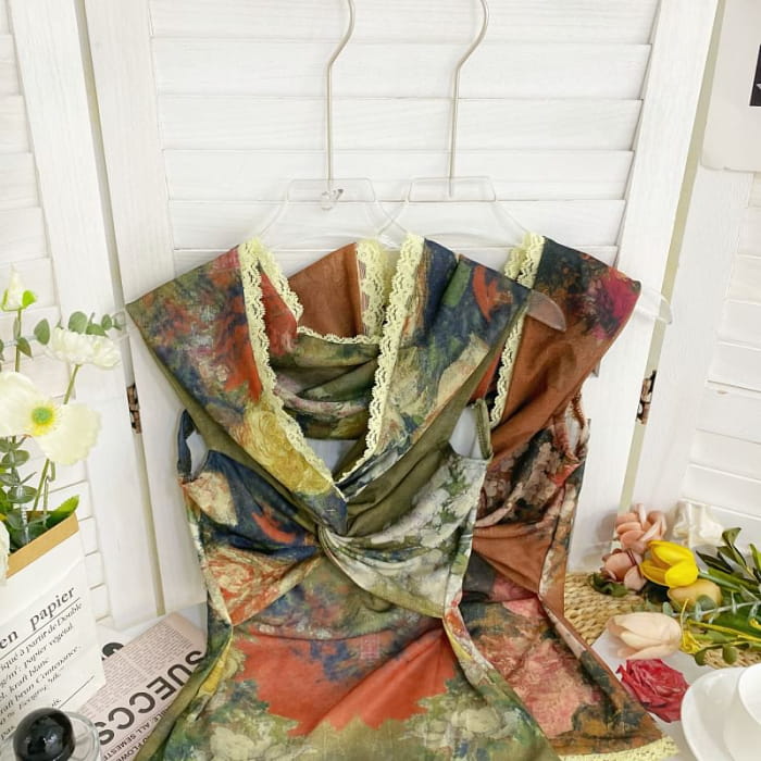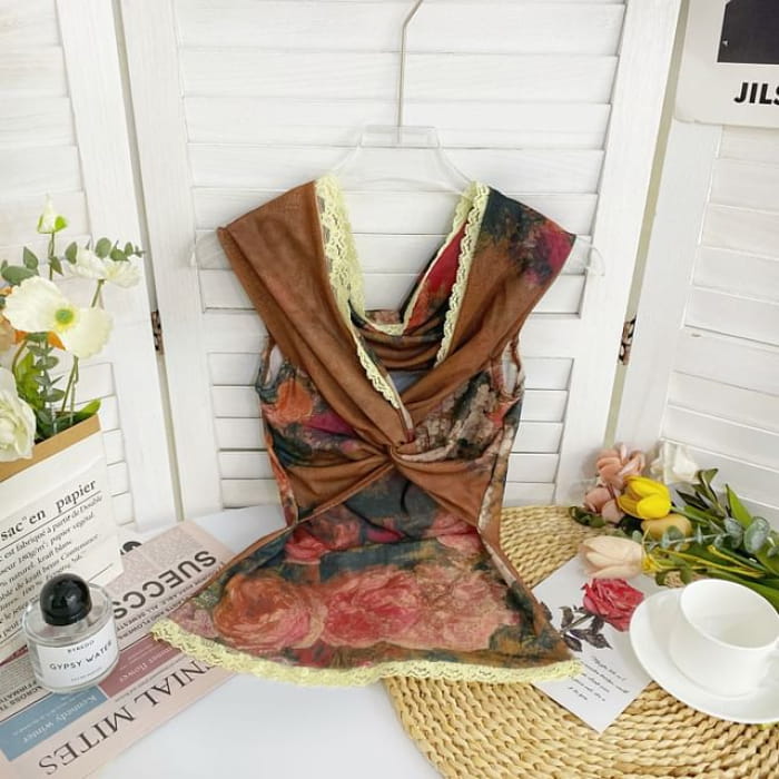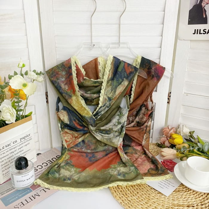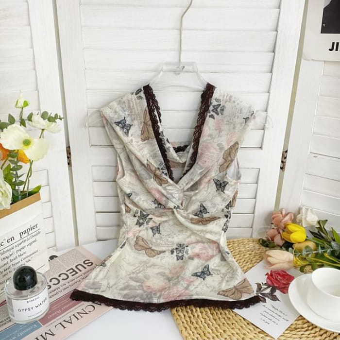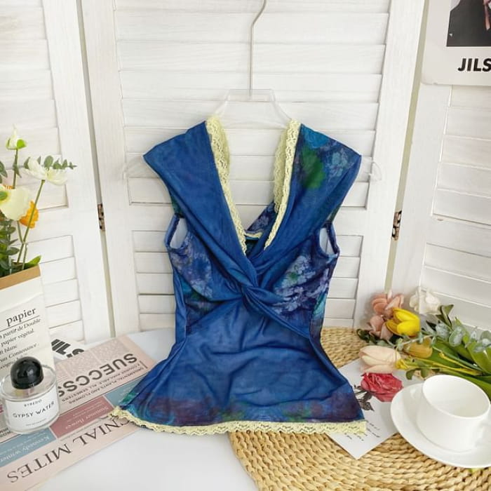 Tanktop mit V-Ausschnitt, Spitzenbesatz und Print
