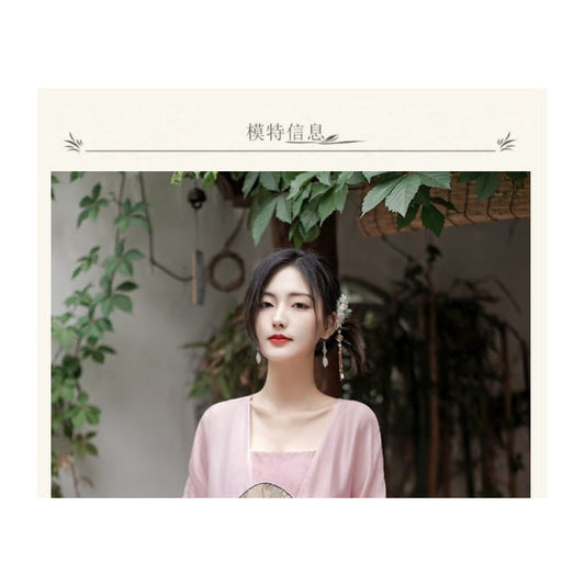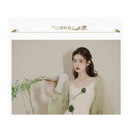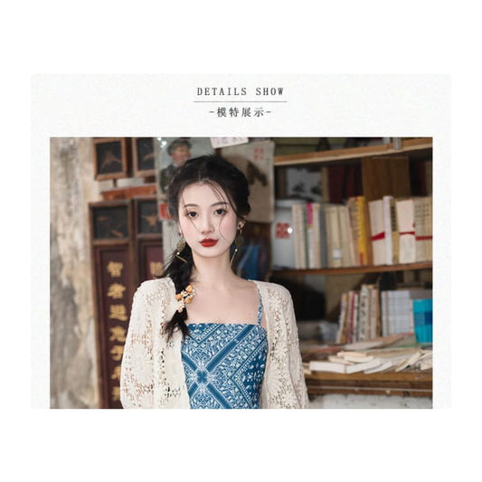 Set: Spaghetti Strap Jacquard Midi A-Line Dress + Short-Sleeve Frog Button Cropped Blouse