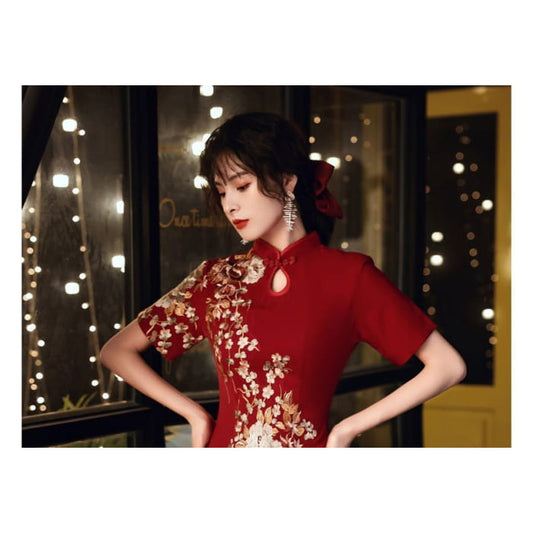 Short-Sleeve Side-Slit Qipao / Flower Embroidered A-Line Qipao