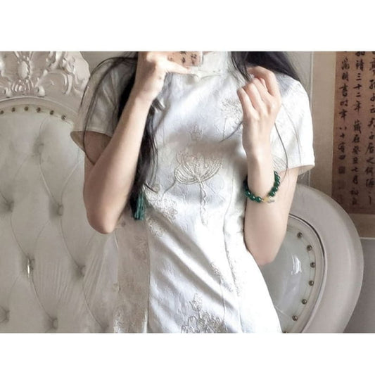 Elbow-Sleeve Band Collar Floral Embroidered Midi Qipao