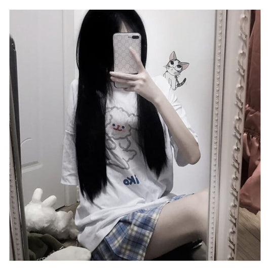 Elbow-Sleeve Crew Neck Cartoon Print T-Shirt