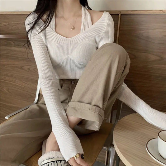 Fit Halter Mock Slim Knit Ribbed Two-Piece Top Long-Sleeve Neck Plain