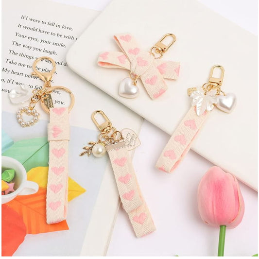 Heart Strap Faux Pearl Bag Charm Keyring (Various Designs)