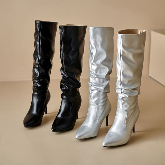 Heel Tall Plain Toe High Leather Faux Pointed Boots