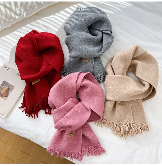 Lettering Applique Fringed Knit Scarf