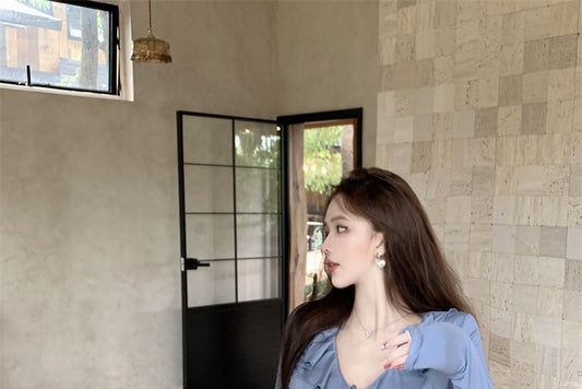 Long Sleeve V-Neck Plain Button Ribbed Knit Top