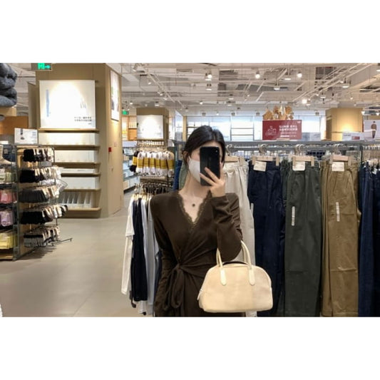 Long Sleeve V-Neck Plain Wrap Slit Maxi A-Line Dress