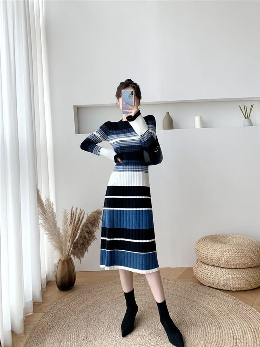 Long-Sleeve Crew Neck Striped Ribbed Knit Midi A-Line Dress