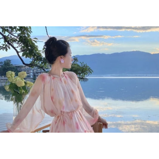 Long-Sleeve Crew Neck Tie Dye Ruffle Midi A-Line Dress