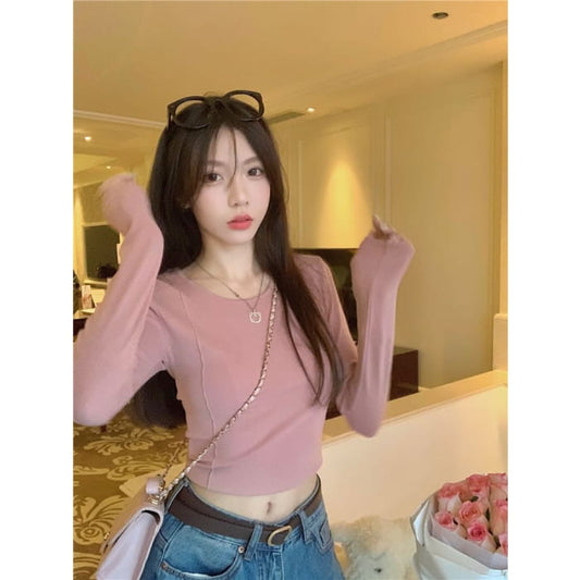 Long-Sleeve Crewneck Plain Crop T-Shirt