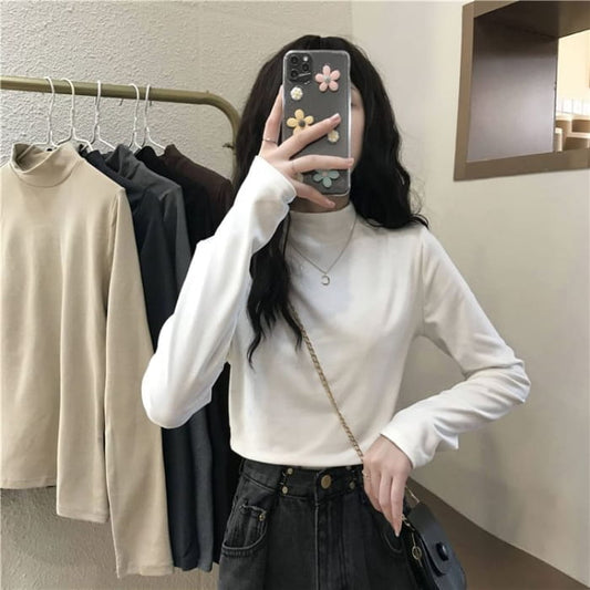 Long-Sleeve Mock Neck Plain Sheer Panel Slim Fit Knit Top