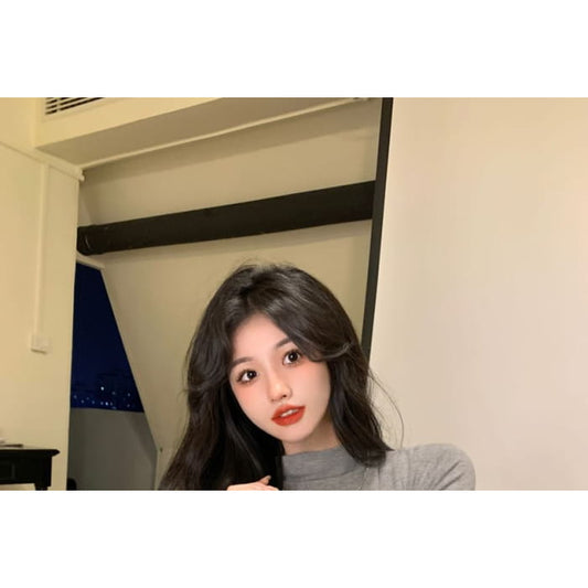 Long-Sleeve Mock Neck Plain Tee / V-Neck Gingham Quilted Half-Buttoned Midi Jumper Dress