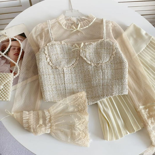 Long-Sleeve Stand Collar Mock Two-Piece Tweed Panel Bow Accent Lace Trim Mesh Crop Blouse