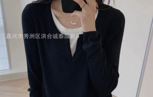 Notch Neck Two Tone Mock Two-Piece Sweater