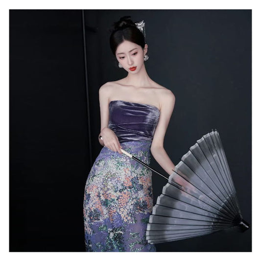 Patterned Sequin Panel Velvet A-Line Tube Evening Gown