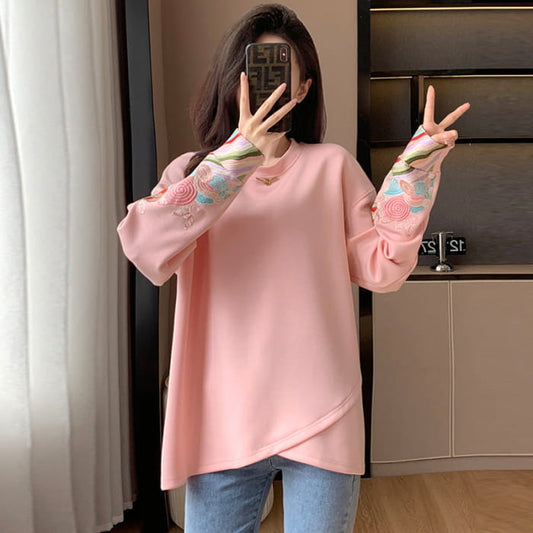 Pink Floral Embroidery Round Neck Shirt Slit Skirt Set