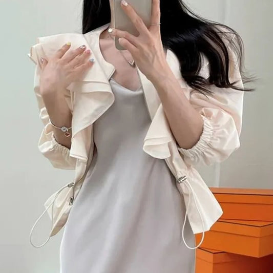 Puff-Sleeve Crewneck Ruffle Crop Blouse