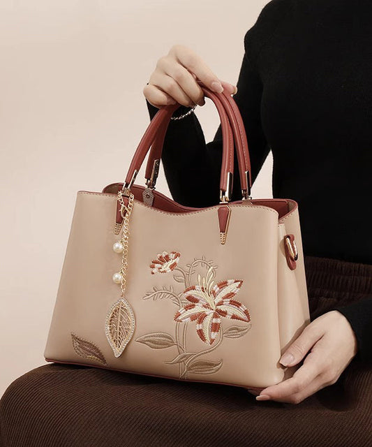 Embroidery Chic Calf Apricot Bag Tote Leather