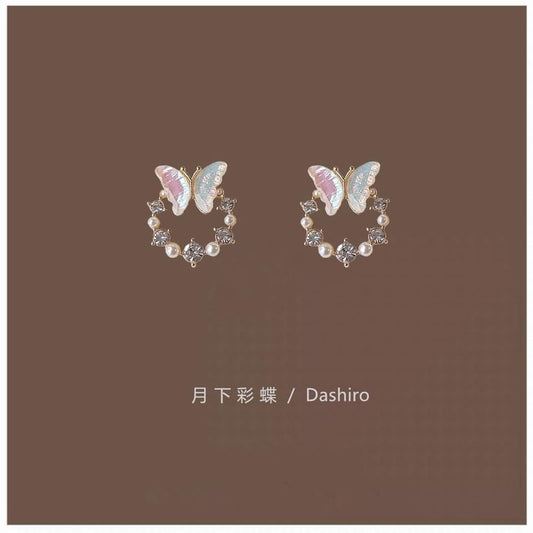 Faux Alloy Stud Earring Butterfly Pearl Rhinestone