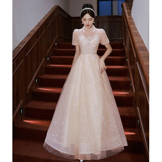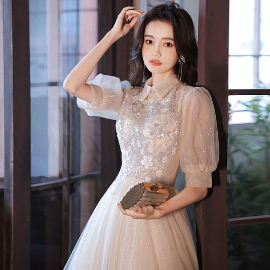 Gown Evening / Short-Sleeve Mesh Dress A-Line Glitter