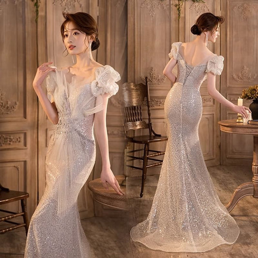 Puff-Sleeve Mesh Sequin Gown Mermaid V-Neck Evening Panel