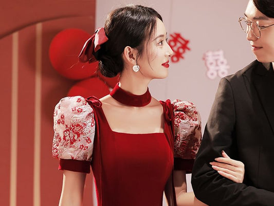Floral Gown Puff-Sleeve Sequined Square-Neck A-Line Evening Designs) (Various