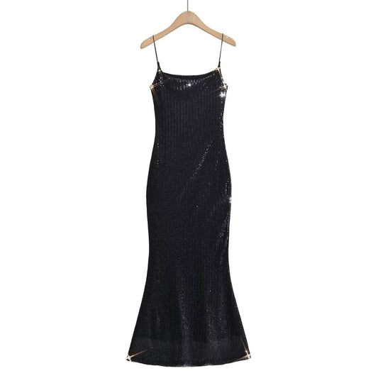 Neck Spaghetti Mermaid Evening Open Gown Back Sequin Strap Scoop