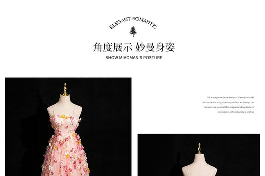 Spaghetti A-Line Mesh Applique Strap Gown Floral Evening