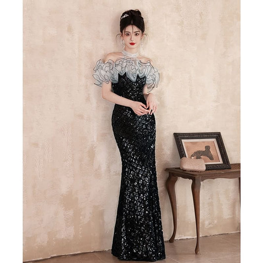 Sequined Gown Ruffled Evening Off-Shoulder Mermaid