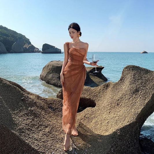 Panel Mesh Gown Strap Evening Spaghetti A-Line Plain