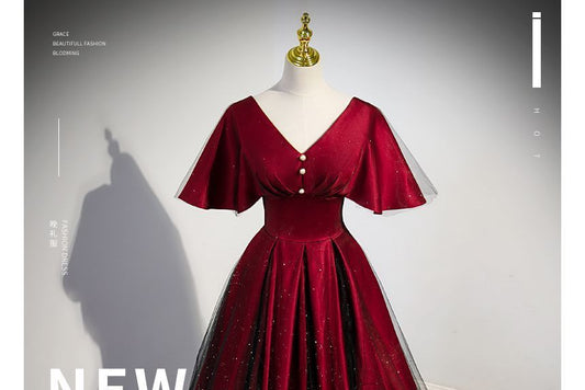 Short-Sleeve V-Neck Lace-Up Back Rhinestone A-Line Evening Gown