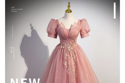 Puff-Sleeve Rhinestone Floral Glitter A-Line Evening Gown