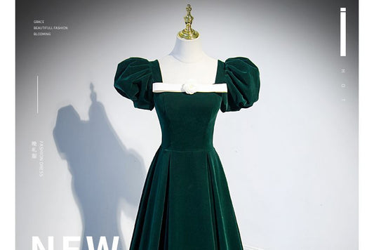 Puff-Sleeve Square Neck Plain Flower Detail A-Line Evening Gown