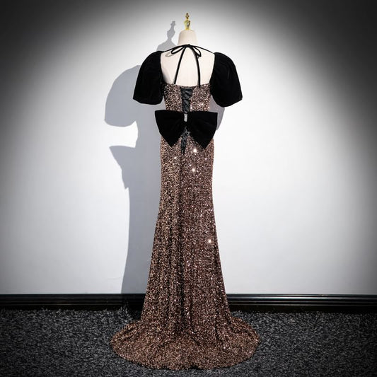 Puff-Sleeve Square Neck Two Tone Bow Back Mermaid Evening Gown