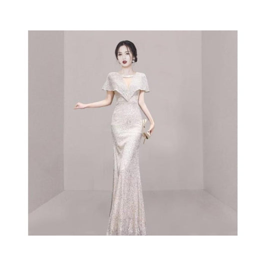 Short-Sleeve V-Neck Plain Mermaid Evening Gown
