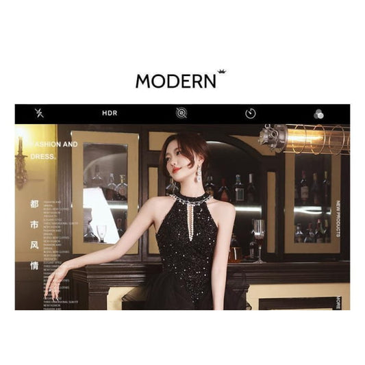 Halter-Neck Sequined Shirred A-Line Evening Gown / Fluffy Cape / Set