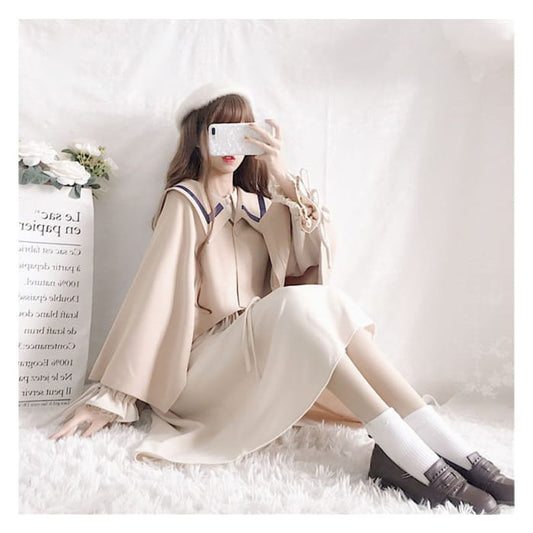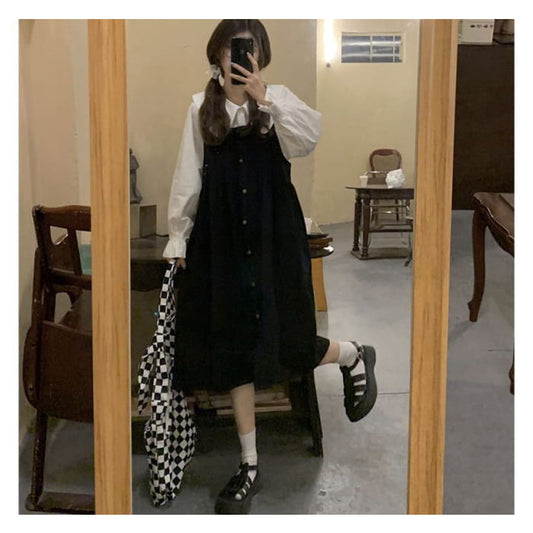 Long-Sleeve Collared Plain Blouse / Square-Neck Plain Midi Overall Dress
