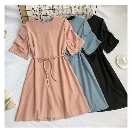 Elbow-Sleeve Crewneck Plain A-Line Dress